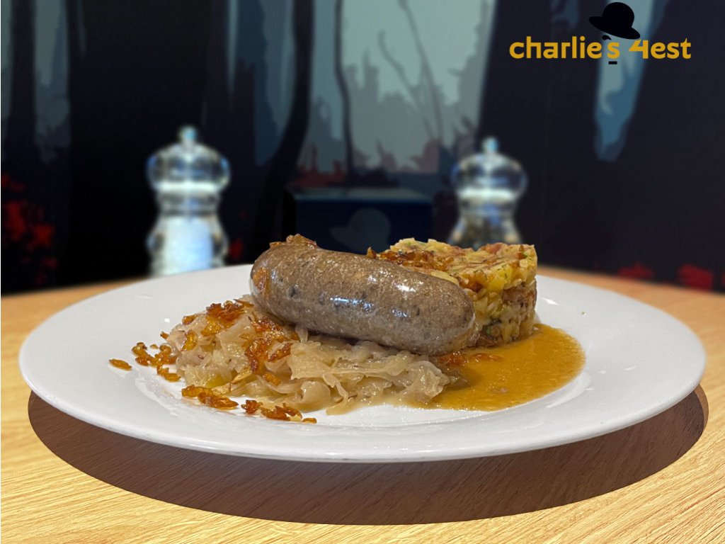 Páteční menu 1 - Pečená jitrnice s dušeným kysaným bílým zelím a škvarkovým bramborem