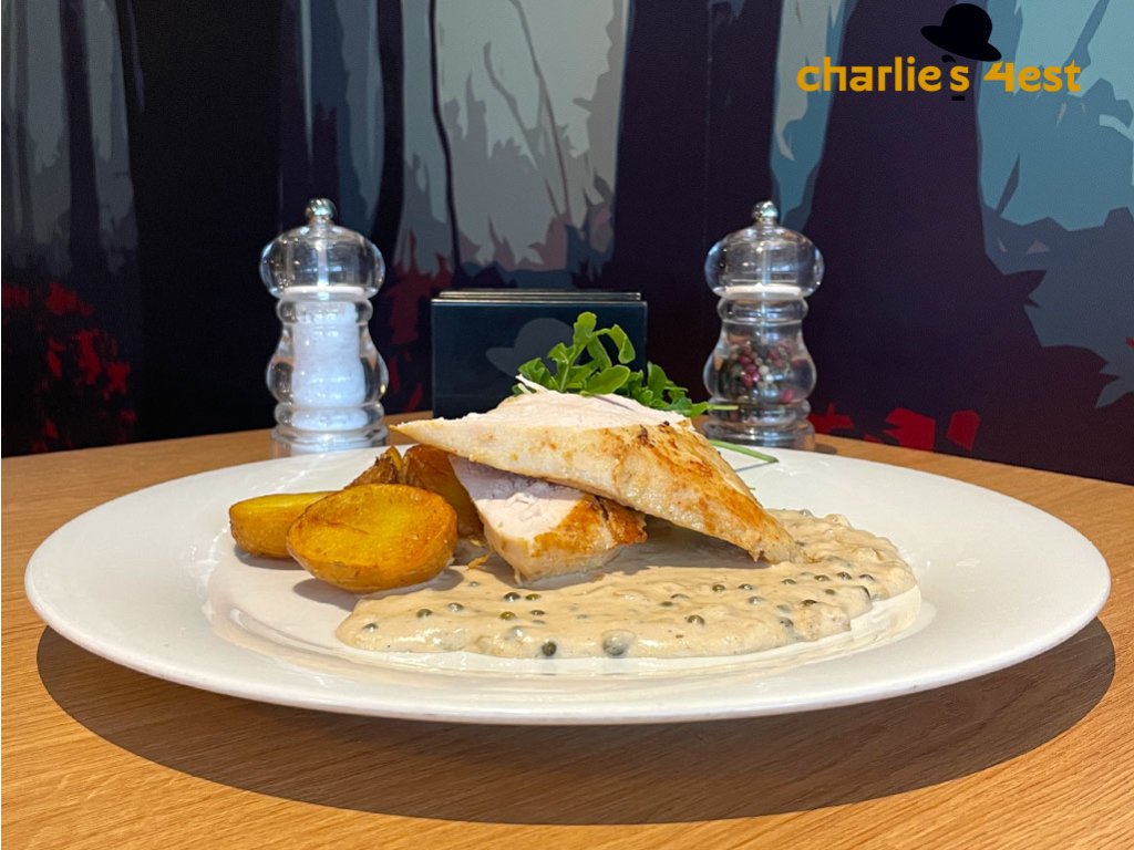 Čtvrteční menu 2 - Kuřecí steak s pepřovou omáčkou a pečenými bramborami Grenaille