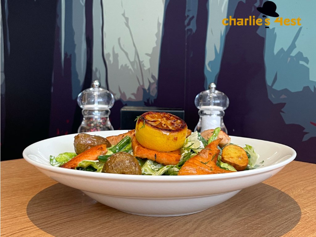 Týdenní menu 6 - TRHANÉ LISTY SALÁTŮ S GRILOVANÝM LOSOSEM, pečenými bramborami Grenaille, fazolovými lusky a koprovým dresinkem